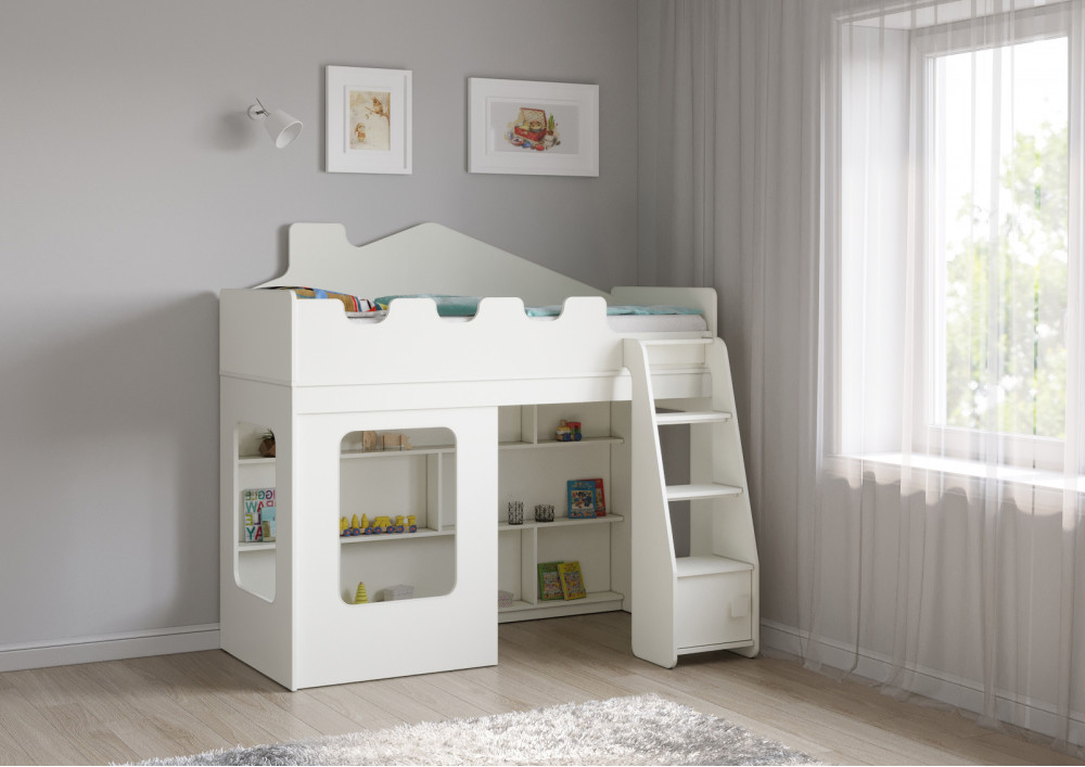 Особенностью этой модели является наличие прямой лестницы с дверцей, которая не только придает кровати-домику особый шарм, но и обеспечивает легкий и безопасный доступ к спальному месту. Стеллаж, расположенный внизу спального места, предоставляет дополнительные возможности для хранения вещей и игрушек.